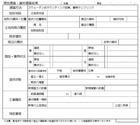 これらの項目にないことで、調査員が現地で立会人や他業種の方から聞いた情報などが記載されています。判定を左右する情報だけでなく、もしかしたら建築計画に関わることもあるかもしれないので、チェックしておくことをおすすめします。