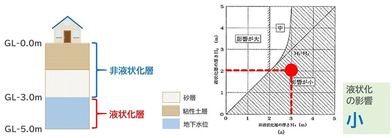 例えば、非液状化層が3m、液状化層が2mだった場合、横軸(非液状化層)の3m、縦軸(液状化層)の2mの交差点が判定結果となり、液状化の影響は「小」となります。