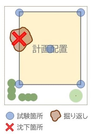 調査データと地形、過去の地歴の解読に問題はありませんでした。そこで、沈下した箇所の近くで原因調査を行ったところ、非常に軟弱な数値の自沈層が確認されました。