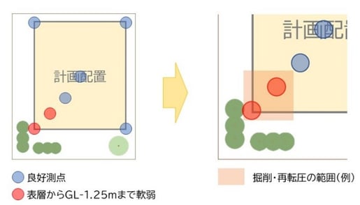 それは、たとえ深さは浅いとしても「建物の両端で地盤バランスが悪い状態」だからです。このままでは、軟弱な測点の方向へ向かって不同沈下を起こしかねません。