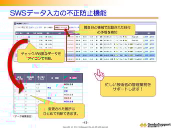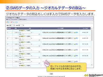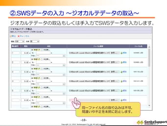 調査報告書には現場調査担当者、解析担当者の氏名と住品協資格者番号が記載されるので、SWSデータの不正入力などありえないことですが、地優陣システムでは、データ取込やデータ更新訂正の状況を視覚的に監視する機能があります。