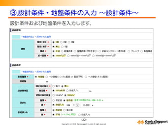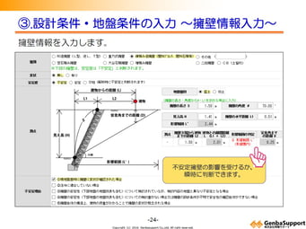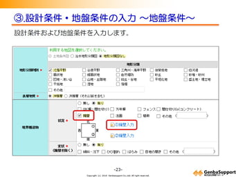 地優陣システムは、報告書に必要な基本的情報および地盤判定プログラムに必要な情報を、漏れやミスがないように入力を促す機能を有しています。以下に地盤判定プログラムの条件となる主な入力項目を示します。