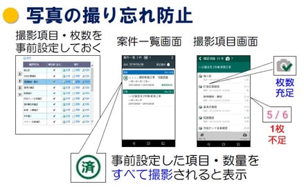現場写真は、事前にシステム上で撮影項目を設定するので、現地で何を撮影しなければならないのか一目瞭然で、撮り忘れ防止につながります。