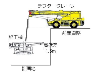 図のような前面道路より計画地が1.5mほど低い高低差のある現場での鋼管杭工事の事例です。