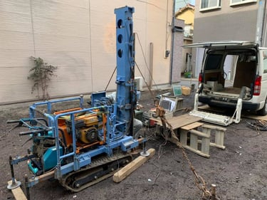 三成分コーン貫入試験(CPT)は、三つの成分(先端抵抗・間隙水圧・周面摩擦力)を測定できる「コーン」を、油圧で静的に貫入して、地盤の支持力・圧密評価、土質判別や液状化判定を行うことができます。 試験機を小型化したため、小規模建築物の特に軟弱地盤の調査に適しています。