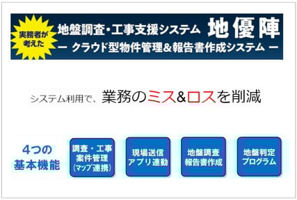 当社は、クラウド型物件管理&調査報告書作成システム「地優陣(じゆうじん)」を使用しています。 地優陣は、(一社)地盤優良事業者連合会が提供しているシステムで、現場SWSデータをスマホで即時確認・即時共有や、地盤判定プログラムなど、独自の機能を有しています。